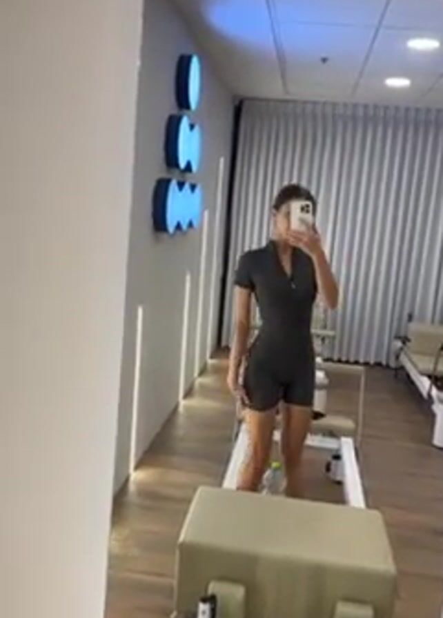 woman in a dark-colored, short-sleeved romper taking a selfie in a mirror inside a Pilates studio