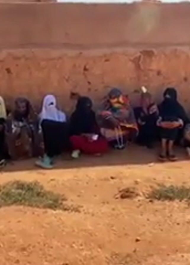 A group of approximately 20 women and children sit in a line along a cracked, orange-colored wall in an outdoor setting. Most are wearing clothing that covers their heads and bodies, some with veils or hijabs. Many hold papers in their laps. One woman walks toward the group, wearing a patterned robe and head covering. A woman stands off to the right side of the group, wearing a long teal robe and matching head covering. The ground is dry and dusty. The sky is clear and bright.