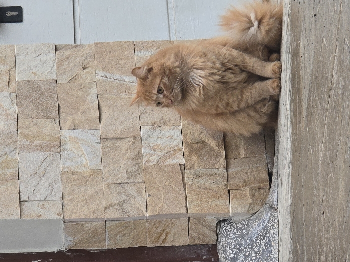 In Berkovitsa, Bulgaria, an outdoor scene features a long-haired, orange-brown domestic cat seated on a light grey concrete surface. The cat faces viewer's left, with its head slightly rotated to observe an area left of center. Its eyes are amber. The background features a corner or column structure clad in light tan and beige rough-cut stone tiles, laid in a staggered horizontal pattern. To the immediate right of the tiled structure, a smooth, light grey vertical panel, possibly a door or wall, is visible, featuring a black security or latch mechanism at the top right. To the far left, a dark brown vertical architectural element meets a grey, speckled, contoured ground object.
