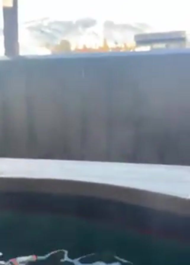 n outdoor hot tub with a view of a snow-covered mountain. The tub is made of wood and is filled with steaming water. The mountain is in the distance and has trees and buildings on it. The sky is blue and there are some clouds.