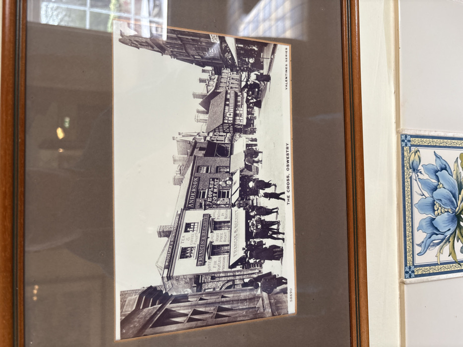 A black and white historical photograph depicts "The Cross, Oswestry, United Kingdom," a bustling street scene