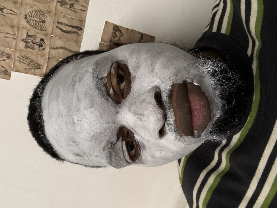 A person's face is painted white, contrasting sharply with their brown skin around the eyes, nose, and lips. The person wears a striped shirt. Behind the individual, anatomical sketches are affixed to the wall. The composition is slightly tilted, causing the face to appear off-center. The white paint is thickly applied, obscuring the underlying skin texture and creating a stark, theatrical effect.