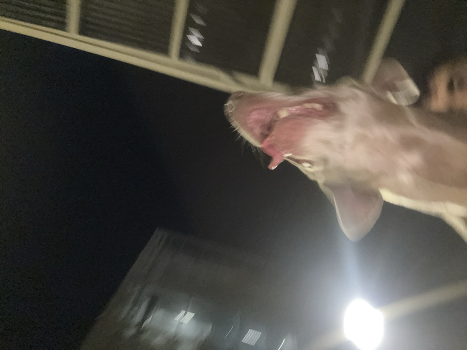 An upward-angled, low-light photograph captured at night in the Gilboa Regional Council, Israel, depicts a light-colored dog, likely white or light tan, positioned in the lower-middle and right frame. The dog's mouth is wide open, tongue extended and pink, revealing teeth and gums, indicating an action such as barking, yawning, or playing. Its body displays significant motion blur. A blurred portion of a human face, exhibiting dark hair, is visible below the dog's chin in the bottom right corner. The background consists of a dark night sky. In the lower-left quadrant, a bright, circular artificial light source creates a prominent glare. To the left of this light, a blurred, dark multi-story building with illuminated rectangular windows is partially discernible. The upper-right quadrant features a blurred, light-colored structure with vertical and horizontal elements, possibly a railing or architectural detail.