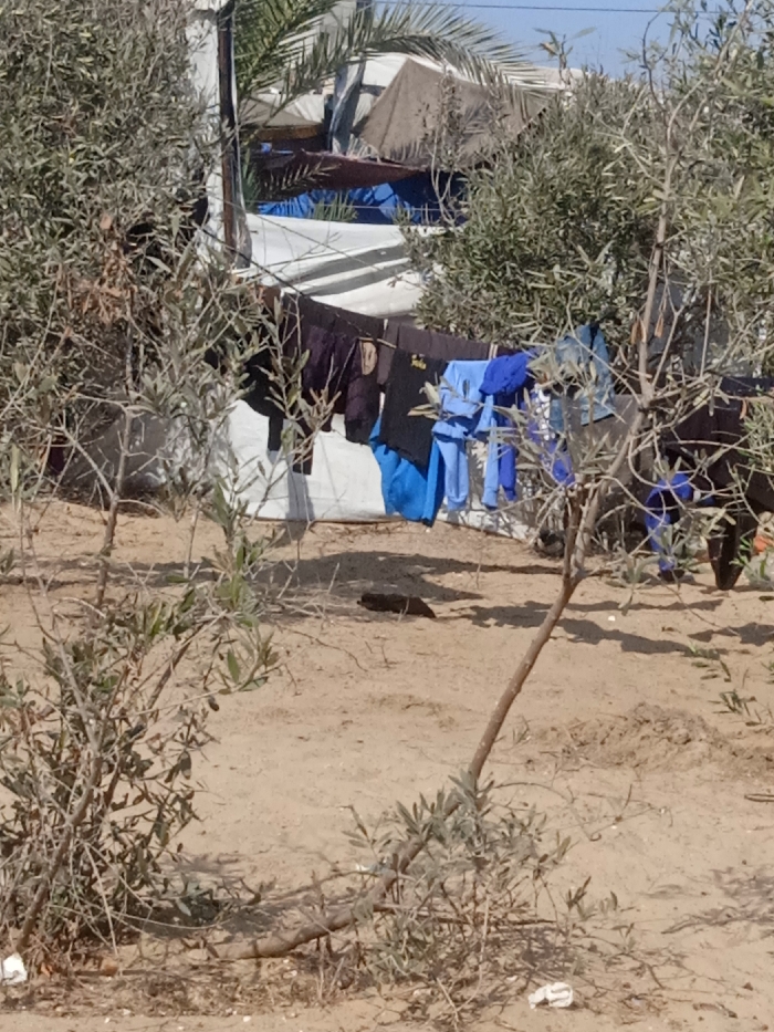 The image displays an outdoor scene in Khan Yunis, an unknown specific location within the city, characterized by arid terrain under clear daylight. The foreground and mid-ground consist of sandy, light brown earth, sparsely covered with small olive saplings and thorny bushes. Several pronounced shadows from these plants and unseen overhead elements are cast across the ground. In the mid-ground, a clothesline is strung across the scene, laden with various garments hung to dry. These include dark blue, black, and light blue items, appearing to be shirts, trousers, and possibly tracksuits. Behind the clothesline, several makeshift shelters or tents are visible. One prominent structure features white tarpaulins or sheets forming a wall, with a darker brown, tent-like structure positioned further back and to the left. Additional blue and white tarp coverings are visible behind and above the clothesline. A large palm frond is noticeable in the upper left quadrant, partially obscuring the background structures. No individuals are present in the frame. On the sandy ground, a dark, elongated object is visible in the mid-ground to the left of center, casting a shadow. A small piece of white debris is present on the ground in the lower right corner. The sky is bright and clear, visible at the top of the image.