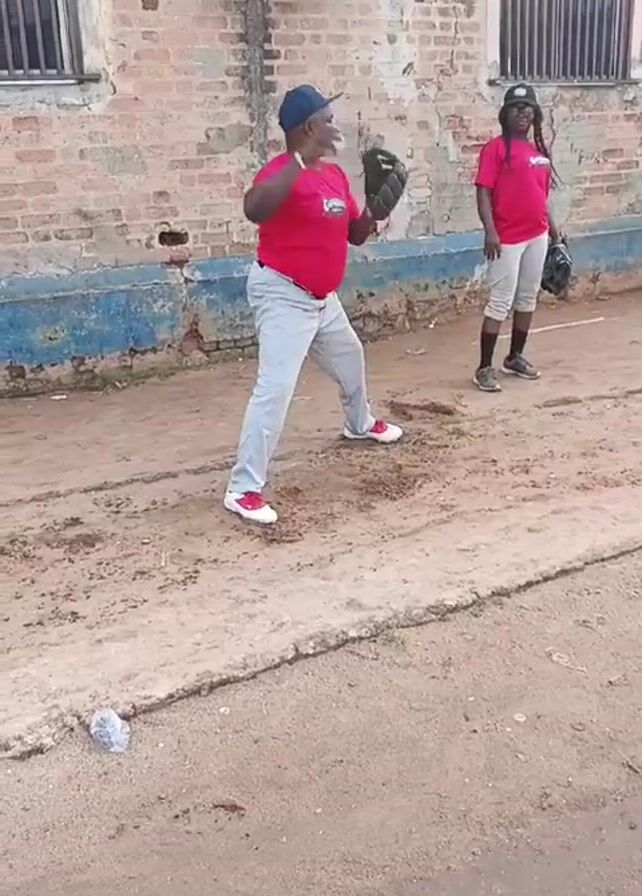 two people in red shirts and baseball caps playing catch with a baseball in a dirt area next to a brick building with barred windows and an air conditioning unit. The man throws the ball to the woman, who catches it. Another person walks behind them. The camera then pans to show a large open field, a building in the distance, and people in the background. The video ends with a shot of a group of people standing near a brick building.