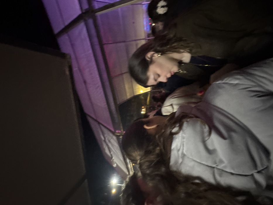 The image depicts a nighttime scene within a crowded event area in Mirandela, Portugal. Overhead, a large, translucent white canopy or tent structure with visible dark framing is illuminated by purple light. In the immediate foreground, the back of a person wearing a light grey hooded puffer jacket is visible, with long, dark, wavy hair falling over their shoulders. To the right, in profile, stands a female with shoulder-length dark, wavy hair, wearing a dark, possibly olive-green jacket over a dark top. She wears gold-toned hoop earrings with an additional dangling element, and her gaze is directed downwards. Indistinct figures comprise a dense crowd throughout the mid-ground and background. A bright streetlight with yellow-white illumination is visible in the upper-left background, beyond the event structure, with other warm-toned lights discernible further in the distance. Individuals are standing in close proximity, suggesting a social gathering or performance event.
