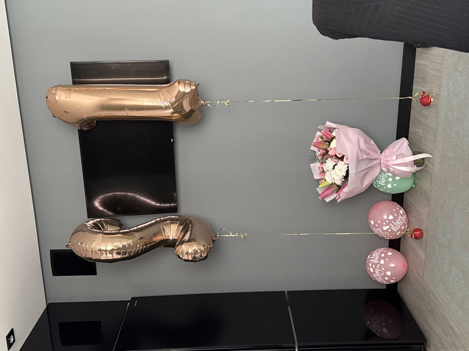 An interior scene in the city of Chișinău, Moldova, displays a celebratory arrangement against a plain gray wall and a light-colored floor. Two large, rose gold foil balloons, shaped as the numbers '2' and '1' (forming '21'), float near the upper portion of the frame, tethered by long, thin, gold ribbons. The '2' balloon is on the left, and the '1' is on the right. A black flat-screen television is mounted centrally on the wall between the balloons, appearing powered off. Two black rectangular speakers are mounted on the wall above and to the left of the television. A tall, dark, possibly black, refrigerator or cabinet is positioned along the far left edge of the image. On the floor, below the balloons, a bouquet of flowers wrapped in pink paper stands in a clear vase. The bouquet contains white and pink lilies, white chrysanthemums, and green foliage. Adjacent to the bouquet and further left, three smaller latex balloons rest on the floor: two are pink and one is mint green, all featuring white "Happy Birthday" text and heart patterns. The gold ribbons from the two large foil balloons are anchored on the floor by small, red, rose-shaped weights, one positioned near the pink latex balloons and the other closer to the flower bouquet.