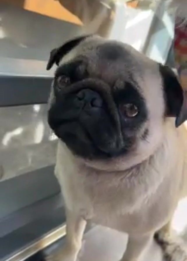 Pug dog standing indoors next to a metallic shelf or counter. The dog is light beige with a dark muzzle. The dog looks up and to the side. The dog is briefly pet. The speaker says, "Natalie."