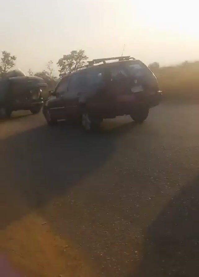 several vehicles parked on the side of a rural road with trees in the background and a bright sky. There is a red car, a dark green van with items piled on top, and a blue van labeled "NIGER STATE TRANSPORT AUTHORITY." The setting appears to be daytime.