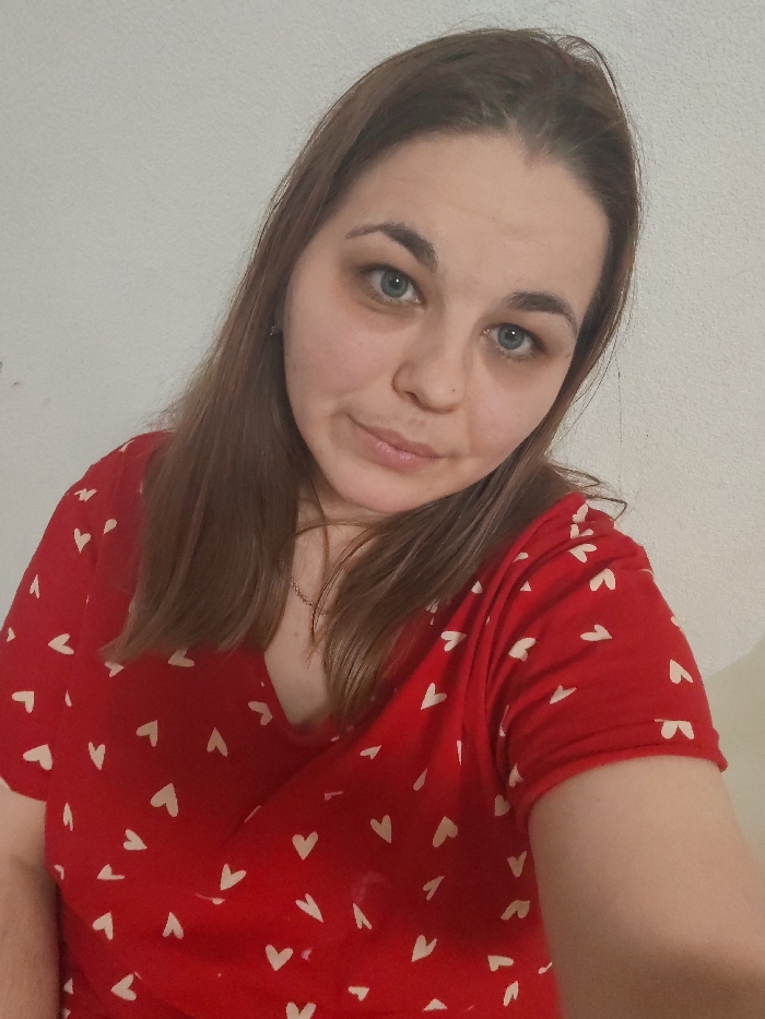 An adult female is depicted in a close-up, likely self-portrait, against a plain light-colored wall. The individual has medium brown hair, blue eyes, and fair skin, with a slight smile and direct gaze towards the camera. She is wearing a red short-sleeved V-neck top patterned with numerous small, scattered white hearts. A thin, silver-colored chain necklace with a small pendant is visible at her neckline, and a small metal earring is present in her left ear. The lighting is even, without harsh shadows. The location is an indoor setting in Chaikovsky, Russia.