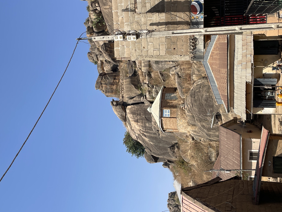 The image captures a static, daytime scene on Rukuba Road, Nigeria, under a clear blue sky. The background is dominated by a rocky hillside composed of large, weathered granite boulders and sparse, dry, yellowish-brown vegetation. A single-story circular structure, built into the mid-section of the hillside, features brick walls, a small rectangular window, and a conical corrugated metal roof. In the foreground, a concrete utility pole with multiple electrical meters and entangled wires stands on the right, partially obscuring a two-story concrete-block building. This building has a ground-floor storefront with an open entrance, a corrugated metal awning, and two yellow jerrycans or gas cylinders on the ground outside. A faded red and blue circular logo is visible on its side. To the left foreground and mid-ground, several single-story residential structures with corrugated metal roofs are visible, some constructed from earth-toned materials. A small, white satellite dish rests on a low structure in the mid-ground. A thick black power line stretches diagonally across the upper portion of the frame. No individuals are present.