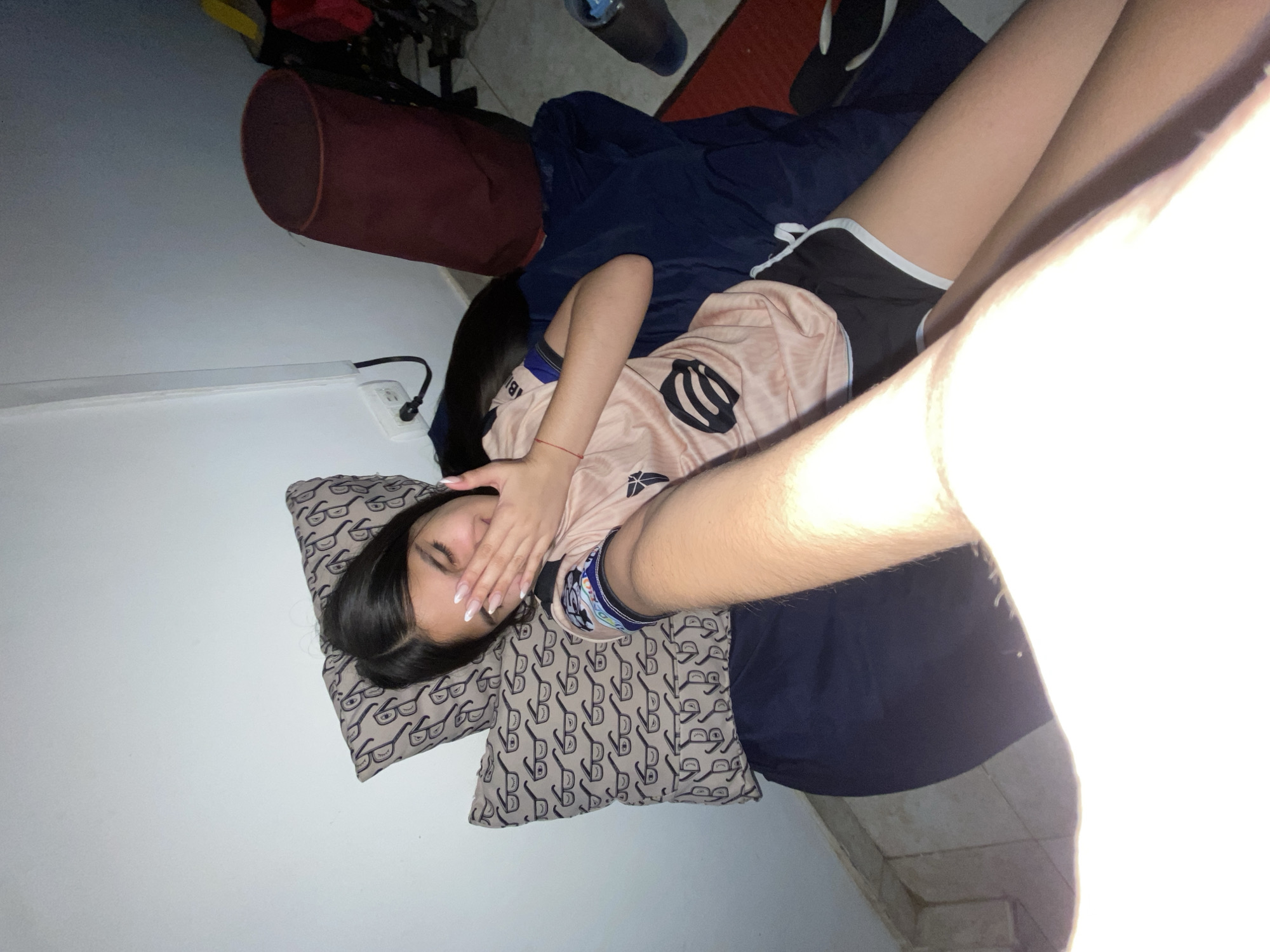 A young person is lying down indoors on two pillows. The pillows have a repeated eyeglass pattern. The person is wearing shorts and a short-sleeved shirt with circular design. The person's hand is covering their face. A red cylindrical object and blue clothing are near the person. A white wall with an electrical outlet is near the pillows. Part of the floor is visible. The location is Cotoperíz, Venezuela.