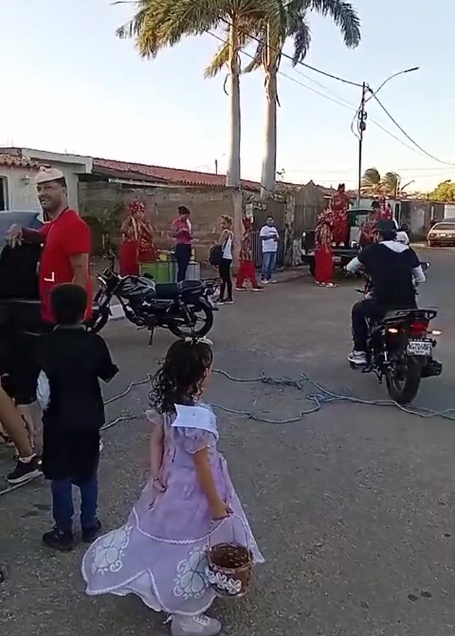 The video depicts a street scene in what appears to be a residential neighborhood. There are several people present, including children and adults. In the foreground, a young girl dressed in a lilac princess costume holds a basket. She is facing away from the camera, observing the activity in front of her. Next to her, a small boy stands, also watching. Behind them, an adult male in a red shirt is visible. Further into the scene, a group of people are dressed in matching red and gold costumes. A man is riding a motorcycle past them, seemingly part of the festivities. Several other adults are standing around, talking and observing. Two motorcycles are parked nearby. A parked car with its trunk open has speakers and balloons inside. A young boy sits on a green stool next to the car. An adult male wearing a cap, a sleeveless shirt, and shorts stands next to him, gesturing with his hands as if speaking. The setting includes houses, palm trees, and power lines overhead. The overall impression is a lively gathering or parade taking place in the street.
