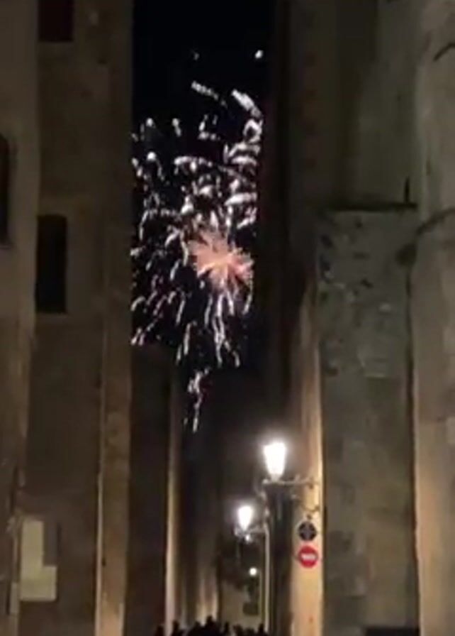 fireworks exploding over a narrow street at night. The street is lined with tall, old stone buildings. A crowd of people is walking along the street, looking up at the fireworks. Street lights illuminate the walkway. There are traffic signs visible. The fireworks are white and other colors. The sky is black.