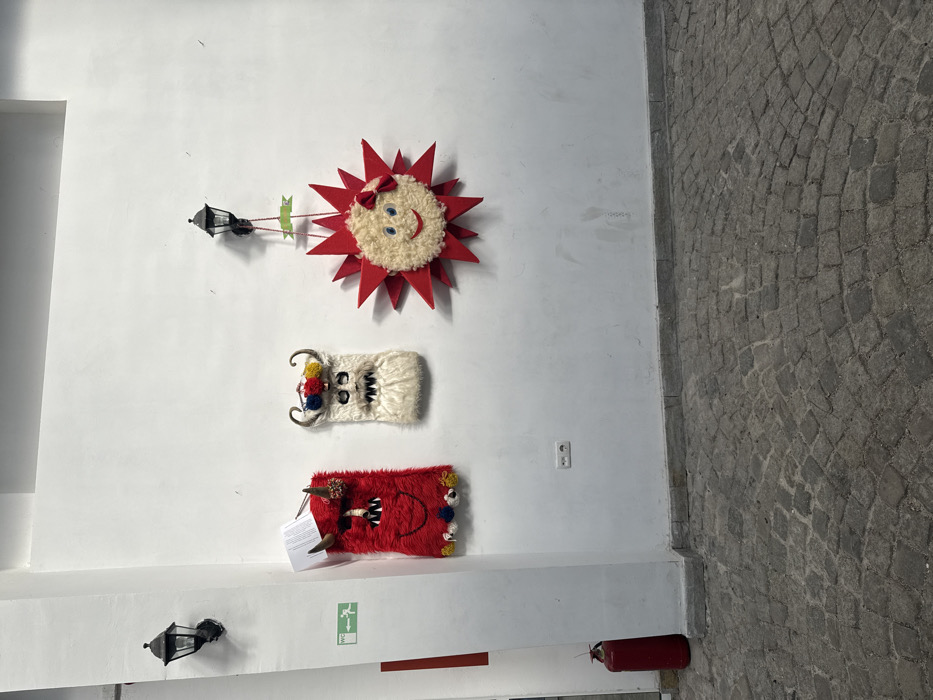 A white building wall stands over a grey cobblestone ground in Tryavna, Bulgaria. Three folk-art inspired textile wall hangings are displayed on the wall. On the left, a rectangular red shaggy figure resembling a monster mask features two brown horns, white fangs, black eyes, and colorful pompoms along its lower edge. Several white papers are partially tucked behind the upper left portion of this red figure. To its right, a similar rectangular white shaggy figure, also a monster mask, displays two brown curved horns topped with colorful pompoms, white fangs, and black eyes. Further right, a circular sun-like figure is composed of red pointed rays surrounding a cream-colored fluffy face with blue eyes, a red smiling mouth, and a small red bow. This sun figure hangs from a hook via a red string and a small green banner. Adjacent to the left wall edge, a red fire extinguisher rests on the cobblestone ground. Above the fire extinguisher, a green "WC" sign with a white arrow points right. Two black wall lanterns are mounted: one to the upper left of the red figure and another above the sun figure. A white double electrical outlet is present on the lower wall section, centered below the white monster figure. The cobblestone ground exhibits a fanned pattern.