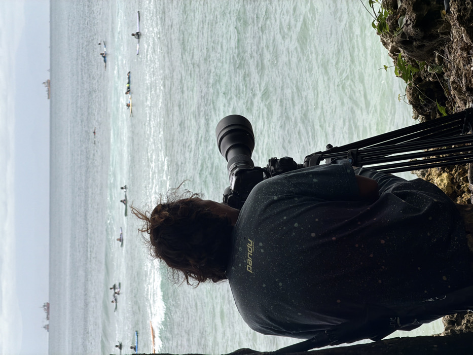 An individual with curly brown hair, viewed from behind, operates a black digital camera equipped with a large black telephoto lens, mounted on a black tripod. The person wears a dark grey t-shirt with white speckles and the text "pandy apparel" on the upper back. They are positioned on a rocky, uneven coastal outcrop with sparse green vegetation, observing an expanse of light blue-green ocean. In the midground, approximately 10-15 individuals on surfboards or bodyboards are dispersed across the water, some appearing to paddle or wait for waves; a small breaking wave is visible to the left. In the far background, several large cargo ships or tankers are visible on the horizon beneath an overcast sky, with faint distant landmasses. The scene depicts a surfing activity on the coast of Nusa Dua, Indonesia.