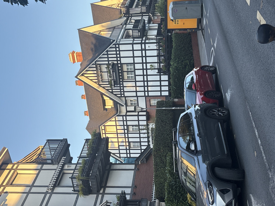 This image depicts a residential street scene in Getxo, Spain, under clear, late afternoon or early evening sunlight. The primary subjects are a row of multi-story buildings characterized by white facades with prominent black timber framing, often referred to as Tudor Revival or similar architectural style. These buildings feature dark gabled roofs with red brick chimneys and multiple balconies with dark railings, some containing green plants. External roller shutters are visible on some windows. Parked parallel to the curb on the street's right side are two vehicles. In the foreground is a dark grey SUV with roof rails, and behind it, a red hatchback is partially visible. The asphalt street displays white dashed lines and arrows. A tall street lamp stands between the parked cars and the buildings. A dense green hedge runs along the base of the buildings, separating them from the sidewalk. Further down the sidewalk, a grey portable toilet is situated next to a yellow construction barrier or sign. A dark, rounded bollard-like object is partially visible in the lower right corner of the frame. No individuals are visible in the scene. The low sun angle casts golden light on the building facades and reflects in the car windows, indicating a clear sky.