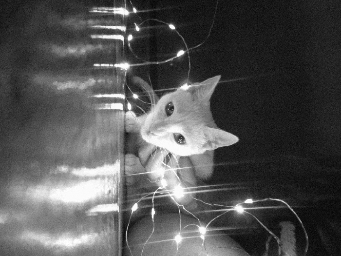 A monochromatic image features a cat amidst string lights