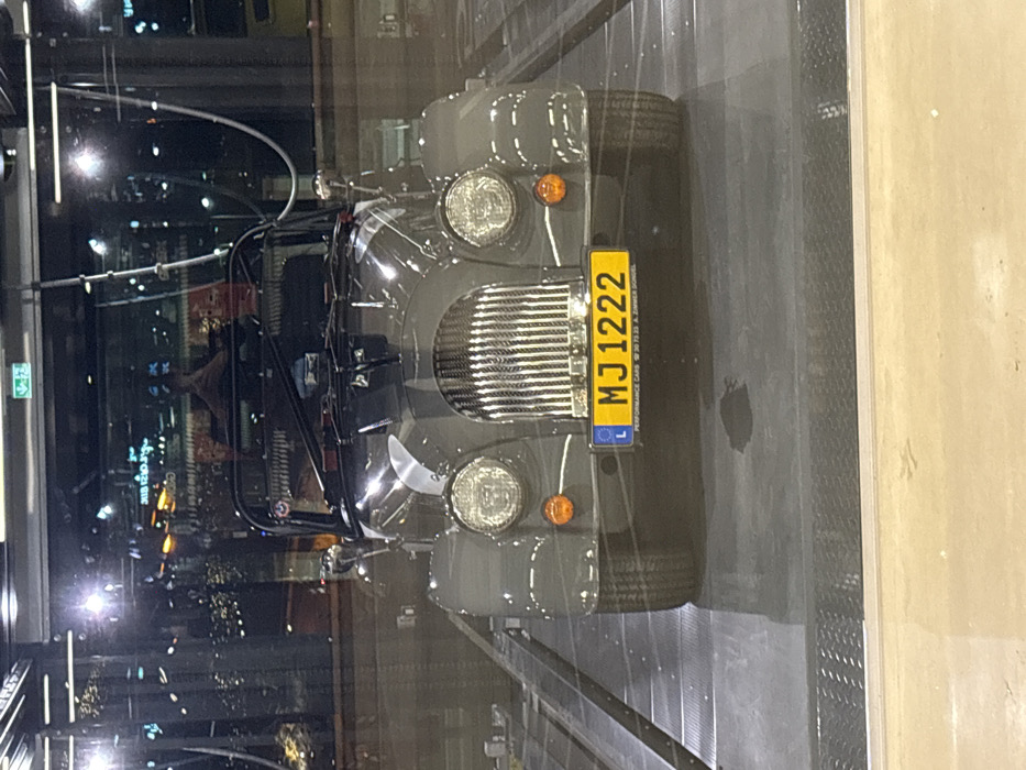 - "The image depicts a dark grey Morgan sports car, likely a Plus Four or Plus Six model, parked indoors on a dark grey, ridged metallic platform" by FM-ErVNw2, licensed under CC BY 4.0