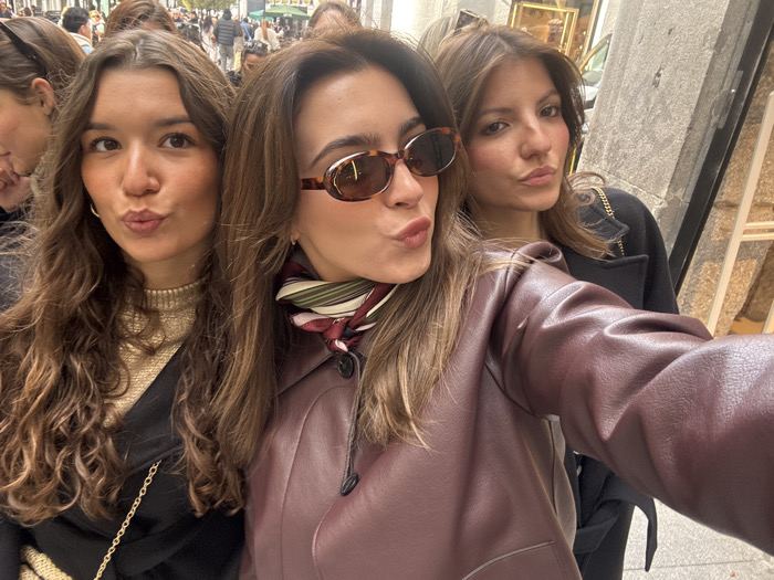 A selfie captures three young adult females posing with puckered lips on a public street in Madrid, Spain
