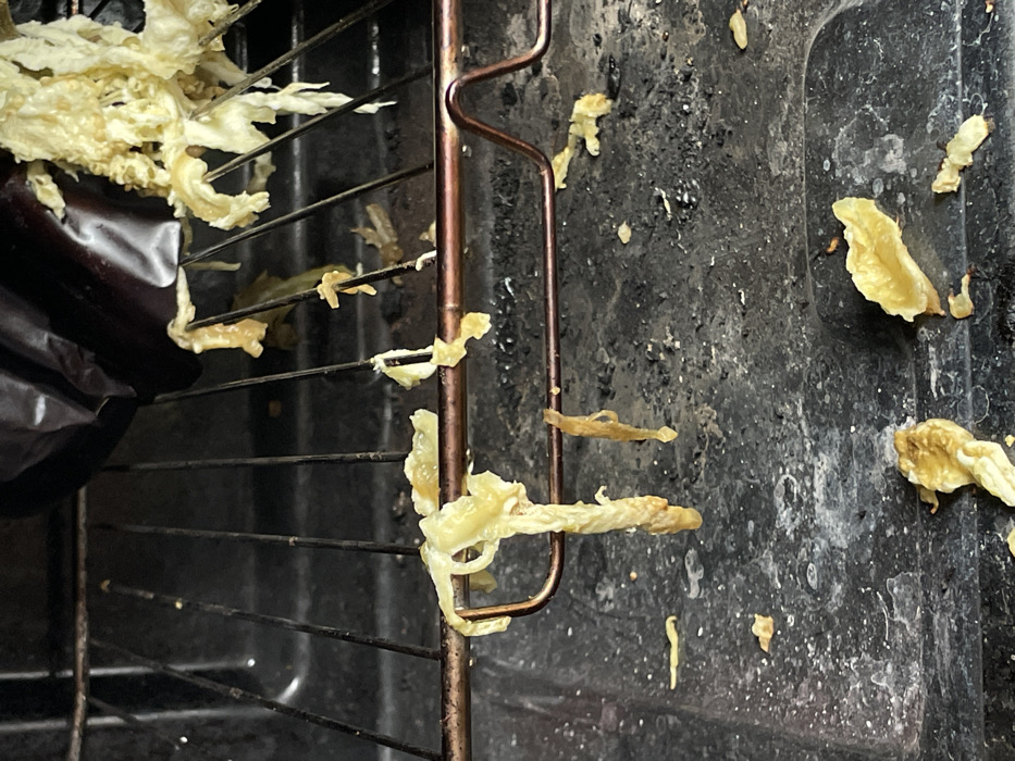 A dirty oven interior features black walls and racks. Food remnants, appearing as dried, yellowish flakes, are scattered on the walls, racks, and around a copper-colored rack support. A dark, partially visible item sits on the rack towards the left, adding to the cluttered and unhygienic condition of the oven.
