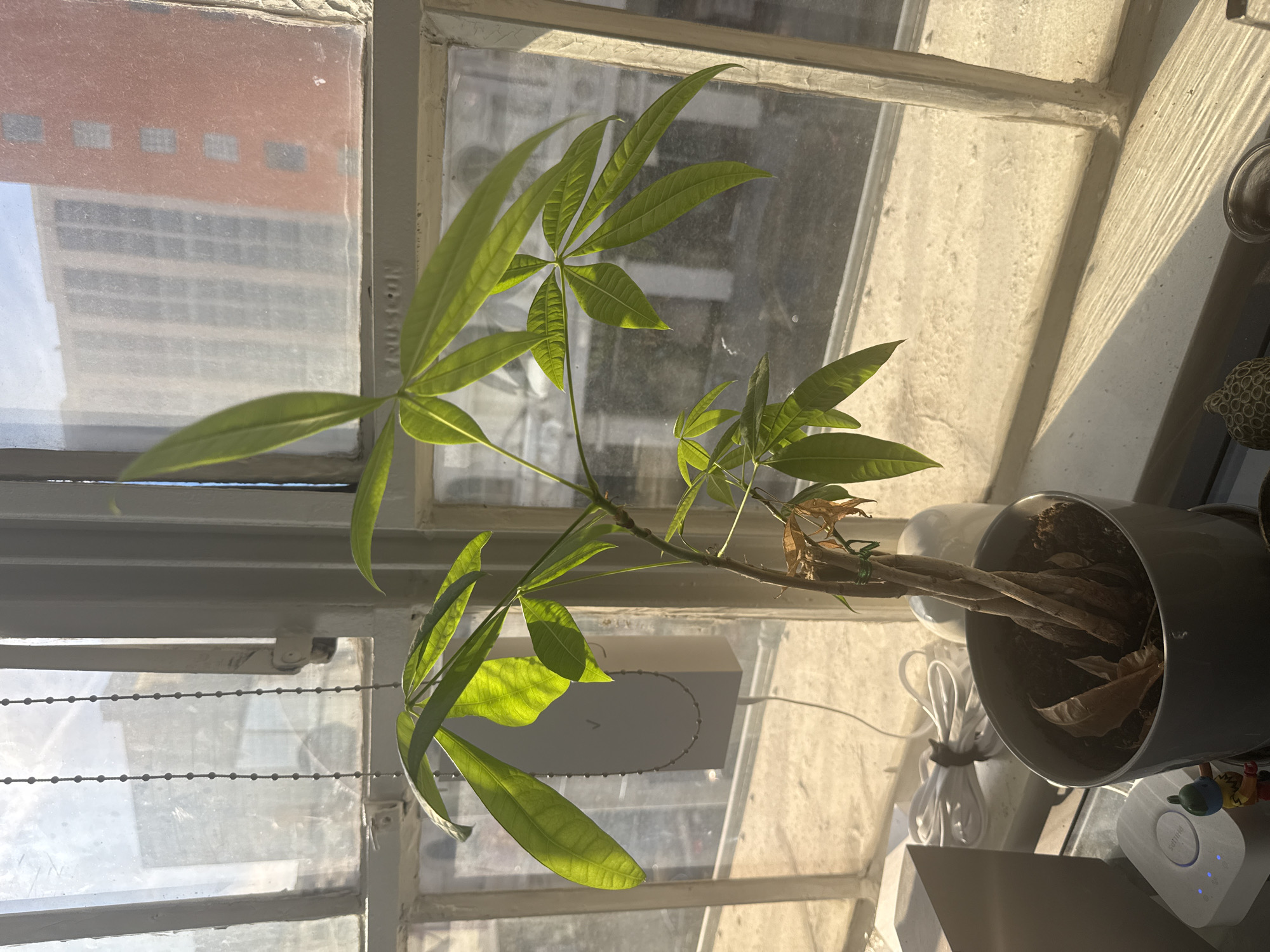 The scene depicts an interior view looking out through an aged window onto an urban environment in Downtown Los Angeles, California, United States of America. In the foreground, a *Pachira aquatica* (money tree) is situated on a windowsill. The plant features numerous vibrant green, palmate leaves, though several desiccated brown leaves are visible at its base. The plant's trunk exhibits a braided configuration, secured by green ties, and is potted in a grey cylindrical container filled with dark soil. The window frame is constructed of white-painted material, exhibiting signs of wear, including chipping paint and surface grime. Beaded chains, typically used for blinds or shades, hang vertically within the upper portion of the frame. On a horizontal window sash divider, the text "VNOUS.COM" is partially legible, indicating a connection to the former Venus Cafe & Lounge in the Historic Core of Downtown Los Angeles, specifically near 529 S Spring St. On the windowsill to the left of the plant, a white Philips Hue Bridge is present, identified by its logo and two illuminated blue LED indicators. Adjacent to this device is a small figurine with a yellow head and a blue and red body. To the right of the plant, a white electrical cable is coiled and secured with a black tie. A white, rounded ceramic or plastic object is partially visible behind the coiled cable. In the lower right foreground, a textured, brown, decorative object is partially visible. A rectangular grey device, bearing a prominent 'V' logo, is suspended near the upper-left window pane, with a thin black cable extending downwards from it. Beyond the window's glass, which appears dirty or frosted in sections, an urban backdrop is visible. To the left, a tall, light-colored building with multiple windows can be observed. To the right, a distinctive reddish-orange, multi-story building with a grid of square windows is prominent. The sky, indicating clear weather, is visible above the distant structures. Natural sunlight, entering from the left, illuminates the plant and windowsill, creating bright areas and subtle shadows.