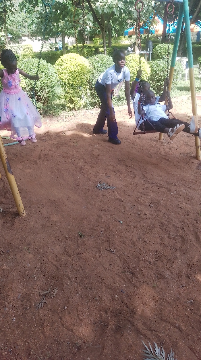 The scene depicts an outdoor playground in Siaya Township ward, Kenya, during daylight hours