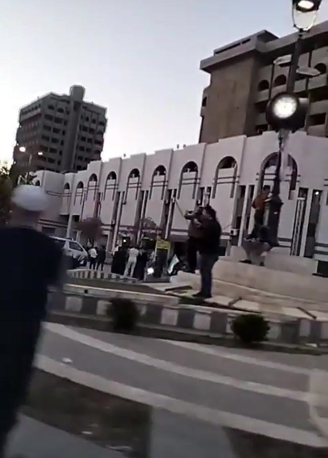 city street scene with people walking around. There's a white, arched building in the background, a clock on a lamp post, and various buildings. People are wearing casual clothing. Some individuals are on scooters. The street seems busy with pedestrian traffic.