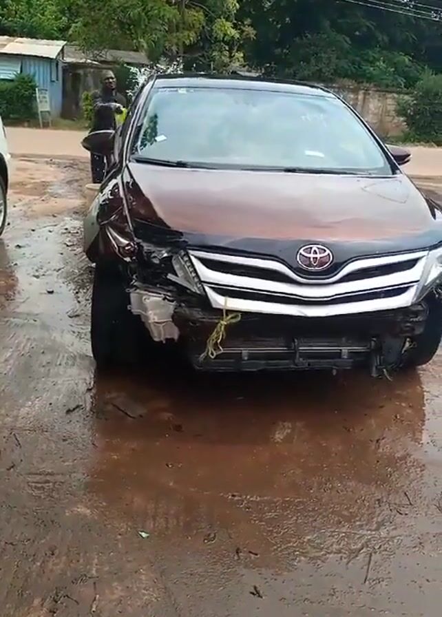 The video depicts a brown Toyota Venza with substantial front-end damage, sitting on a muddy, possibly wet, surface