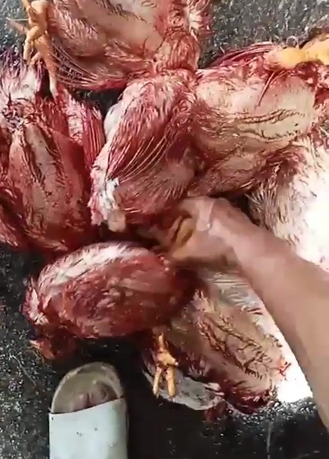 person preparing chickens. A pile of plucked chickens lies on the ground. The person picks up a chicken, opens the abdominal cavity, and then drops the chicken into a metal bowl. The environment appears to be a simple outdoor or semi-outdoor workspace. A pair of sandals is visible.