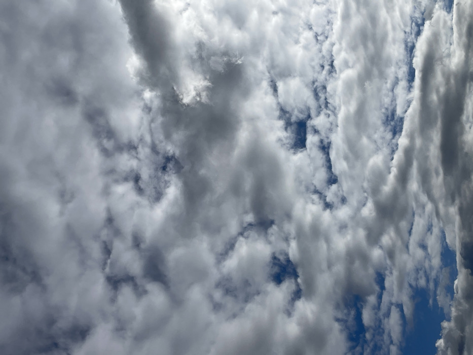 The image displays a sky predominantly covered by a dense, patchy formation of white and various shades of grey clouds
