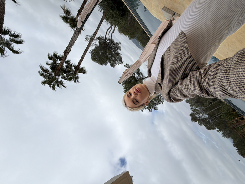 - "An outdoor, low-angle selfie captured in Santa Eulària des Riu, Spain, depicts a light-skinned female subject with blonde hair tied back, wearing a white ribbed turtleneck midi dress and a brown and white glen plaid cropped blazer" by FM-wzXZC3, licensed under CC BY 4.0