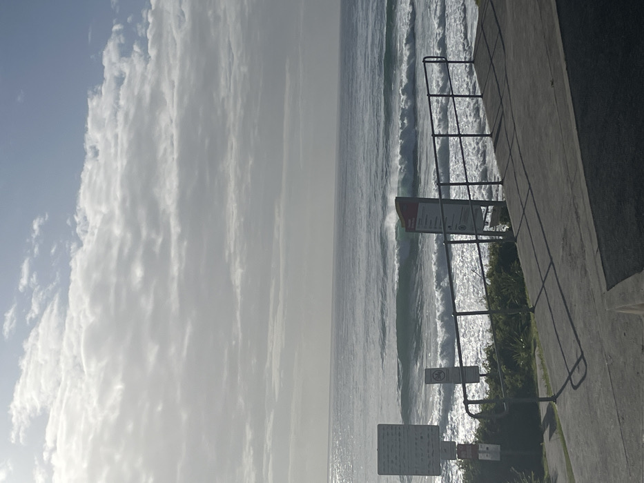A vertical shot shows an overcast sky with thick cloud formations. Below, the ocean has rolling waves that lead to a shore with concrete walls and metal fencing. Signage is visible attached to the fence. Vegetation grows along the shoreline edge. The light is diffused, creating a somber mood.
