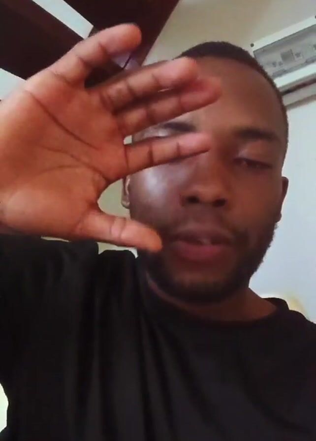 A man wearing a black T-shirt is looking at the camera while sitting in front of a wall and a staircase. The man is raising his right hand towards the camera. The man is speaking.