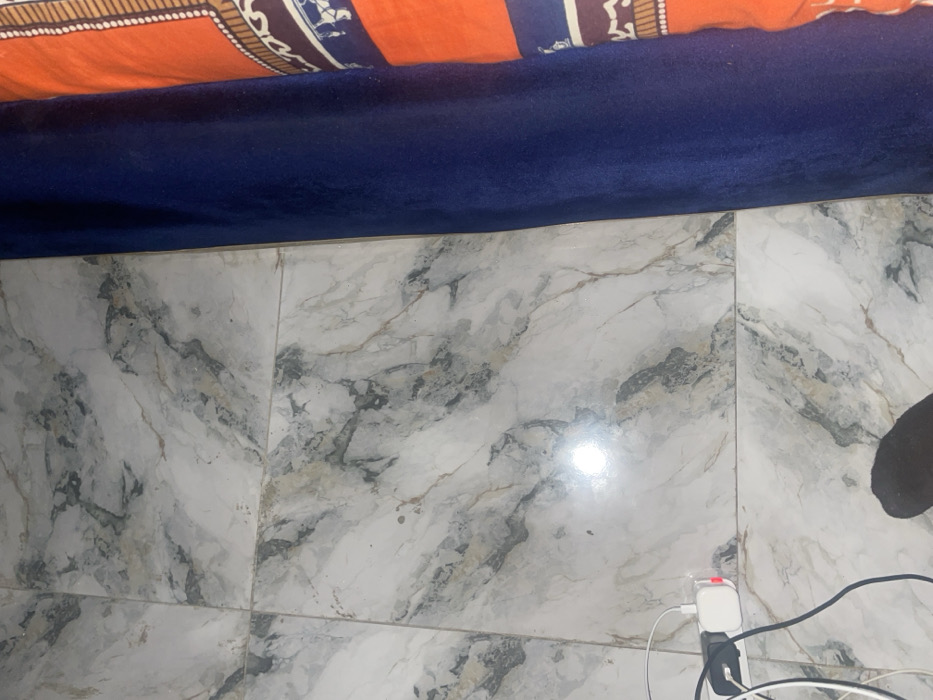 A close-up shot reveals a section of tiled flooring with a distinctive marbled pattern in shades of gray and white. At the top, a portion of a bed or sofa is visible, draped with a dark blue fabric covered with an orange and beige patterned textile. At the lower right corner, a dark blurry shape sits to the side. A white phone charger with a red light sits on the floor with visible white and black cables.