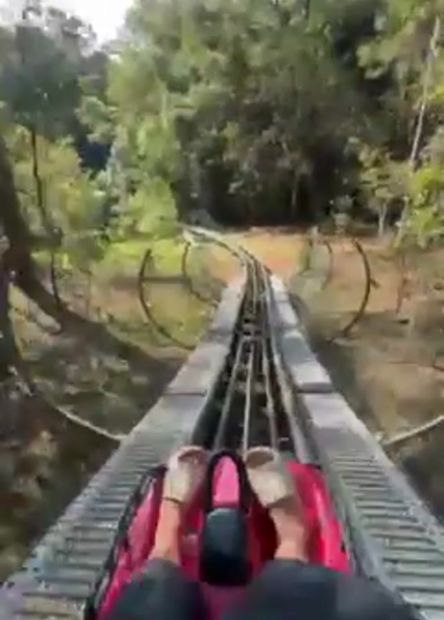 first-person perspective of someone riding a track-mounted luge or alpine coaster through a wooded area