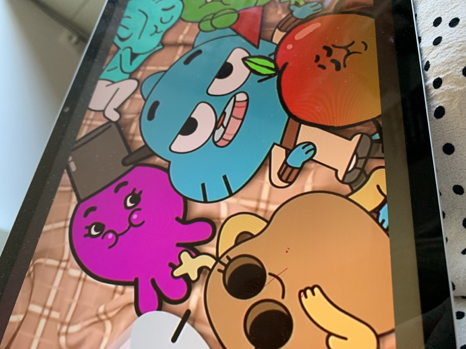 A digital screen, possibly a tablet or laptop, displays animated characters from "The Amazing World of Gumball