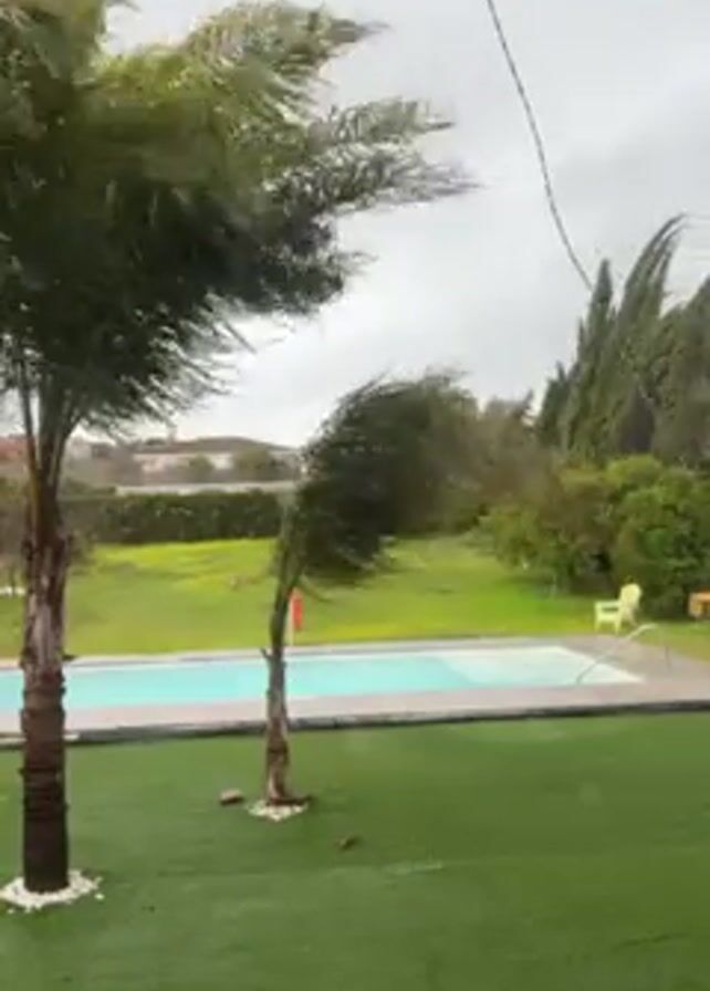 two palm trees in a backyard bending in strong winds. The backyard features artificial turf, a rectangular swimming pool with a white tiled border, and some outdoor furniture including a yellow chair. Tall, slender trees are visible in the background along with a residential building. The sky is overcast. The camera appears to be stationary, filming from under a covered patio.