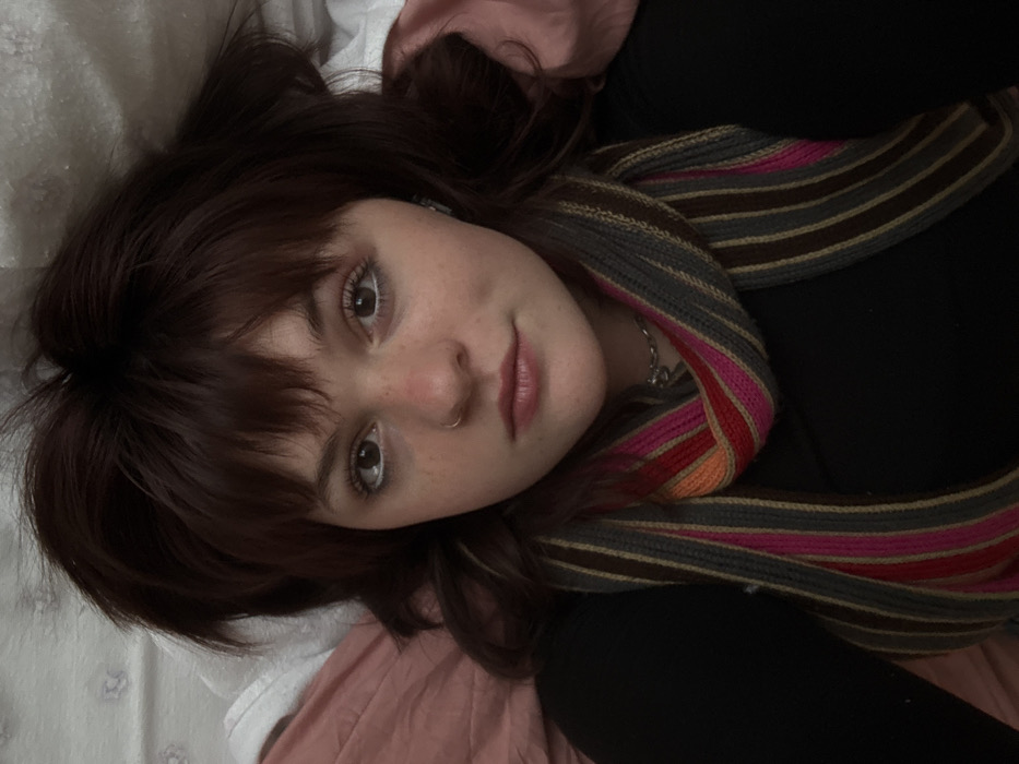 A single female subject is depicted in a supine position, gazing directly at the camera with a neutral expression. Her head rests on a light-colored pillow or bedding, with additional pinkish-brown fabric visible to her left and white fabric to her right. She has dark brown, shoulder-length hair styled with bangs, appearing slightly disheveled. Her complexion is light, with visible freckles across her nose and cheeks. Her eyes are brown, and white eyeliner is applied to her lower waterlines. She wears a small silver hoop nose ring in her left nostril. Her lips are a natural light pink hue. She is dressed in a black long-sleeved top, and a knit scarf is wrapped around her neck. The scarf features vertical stripes in varying widths, displaying colors including dark gray, brown, light tan, vibrant pink, red, and orange. A silver-colored chain necklace with a small, indistinct pendant is visible beneath the scarf. Small, indistinct earrings are present in both earlobes. The immediate environment appears to be an indoor setting, likely a bed, but no specific features are visible to determine the precise location within the city of Cortona, Italy, or any other geographical area.
