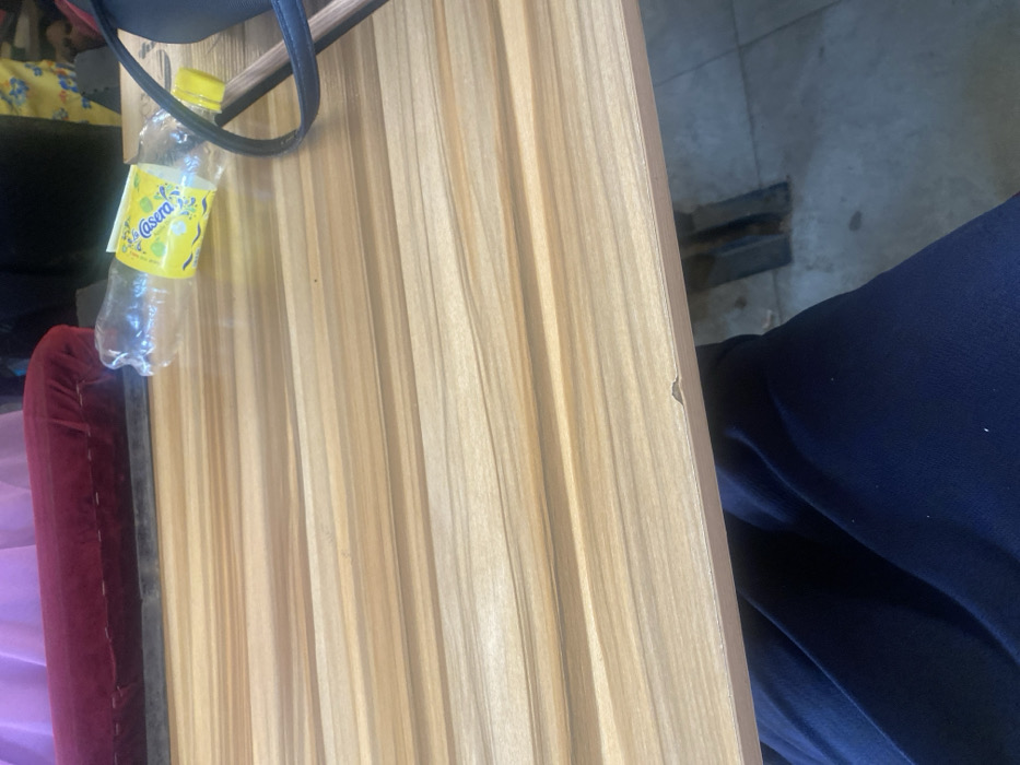 A light wood table dominates the image with vertical grain patterns. A plastic bottle labeled "Casera" sits near the table's edge, next to a black handbag with a blue strap. A red cushioned chair peeks into the frame from the left. Part of a navy blue garment is visible on the right side of the table, suggesting someone seated nearby. The floor is visible in the background.