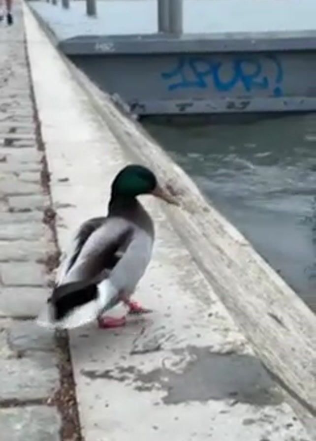 The video depicts a mallard duck standing on a concrete ledge along a riverbank