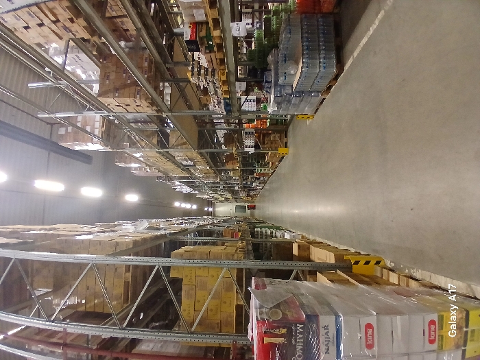 The image displays a long, well-lit indoor warehouse or storage facility aisle. The floor is composed of light gray concrete, leading into the distance. Tall, multi-level metal industrial shelving units, silver-gray in color, line both sides of the aisle, extending out of frame at the top and into the far background. These shelves are densely packed with goods, primarily brown cardboard boxes stacked on wooden pallets, indicating bulk storage. In the immediate foreground on the left, a stack of shrink-wrapped packaged products is visible, featuring partially discernible brand names such as "MAHMO," "NAJJAR," and "kane" on white and red packaging. Yellow and black striped corner protectors are affixed to the base of the shelving uprights in the foreground. On the right side of the aisle, in the mid-ground, multiple stacks of shrink-wrapped bottled water are palletized on the floor, alongside other packaged goods. A faint white line is painted on the concrete floor along the right side. Overhead, a series of bright, elongated light fixtures illuminates the entire aisle. No individuals are present in the scene. The specific location within the city of Frankfurt, Germany, is not discernible from the provided visual information. The bottom-left corner of the image contains a "Galaxy A17" watermark.