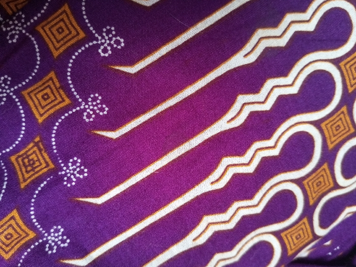 The image presents a close-up detail of a patterned textile, exhibiting a visible textured weave. The fabric is predominantly purple, serving as the background for the design elements, which are rendered in white and orange-gold. On the left side of the frame, a vertical series of undulating white dotted lines is present, forming boundaries around solid orange-gold squares that each contain a smaller, concentric square outline. White, four-petal flower-like motifs, also composed of dots, are interspersed along these dotted lines. To the right, multiple parallel, thick, wavy white lines, each outlined in orange-gold, traverse the fabric diagonally. These lines feature a repeating, curvilinear pattern resembling a series of rounded 'S' shapes or abstract elongated keyholes. No individuals, specific objects beyond the textile itself, actions, or discernible external environment are depicted within the frame.