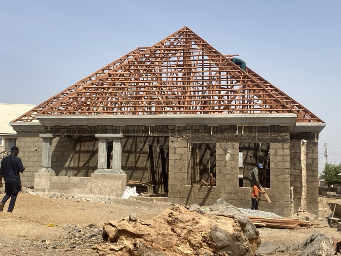 The image displays a construction site in Jos, Nigeria, featuring a single-story structure with block walls and an exposed wooden roof truss system