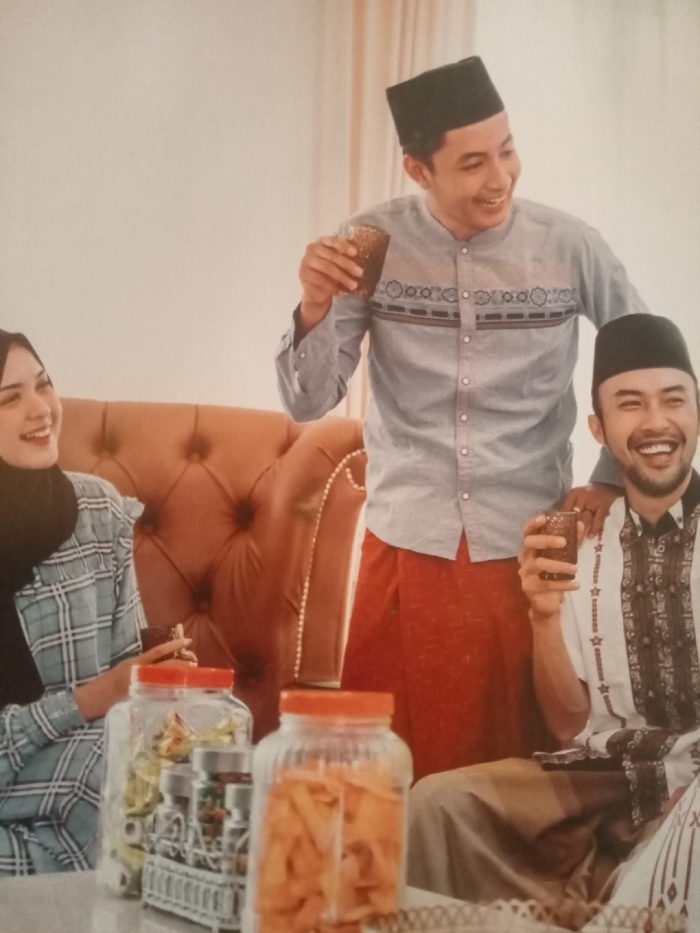 The image displays three individuals in an indoor domestic setting, consistent with a living room in a private residence. A young adult female is seated on the left on a brown tufted sofa, wearing a black hijab and a light blue plaid shirt, holding a small dark object and smiling towards the right. A young adult male stands in the center background, wearing a black peci, a light blue collared shirt with chest embroidery, and a red sarong; he holds a dark, textured glass in his right hand, smiles broadly towards the right, and rests his left hand on the shoulder of another seated male. This third individual, a young adult male, is seated on the right foreground, wearing a black peci, a white patterned shirt, and a light-colored sarong; he holds a similar dark, textured glass in his right hand and is laughing towards the left. On a white surface in the immediate foreground, a white metal tray holds two large clear jars with orange lids, containing various snacks, and a smaller metal rack with six small jars. The background features light-colored walls and beige curtains. All three subjects display positive facial expressions, indicating a cheerful social interaction.