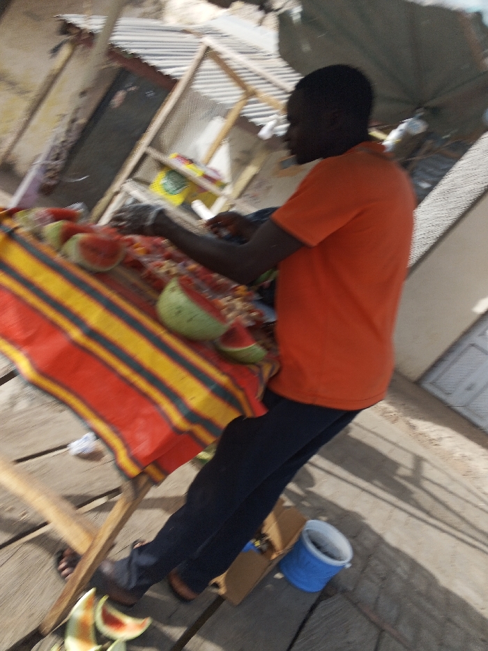 - "A man in an orange shirt and dark pants stands at a table with a striped cloth, preparing watermelon" by FM-nJ3sp2, licensed under CC BY 4.0