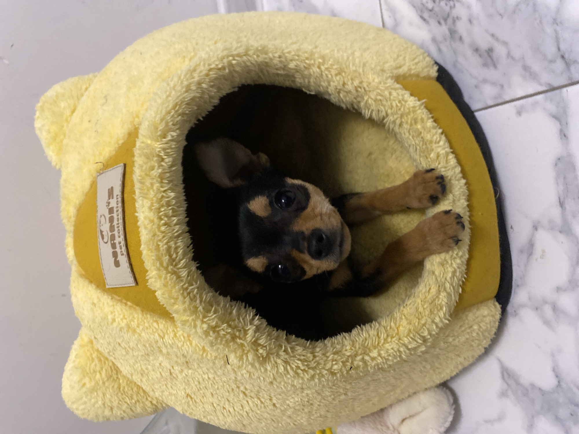 - "A small, black and tan puppy is nestled inside a yellow, hooded dog bed" by FM-NrEC42, licensed under CC BY 4.0