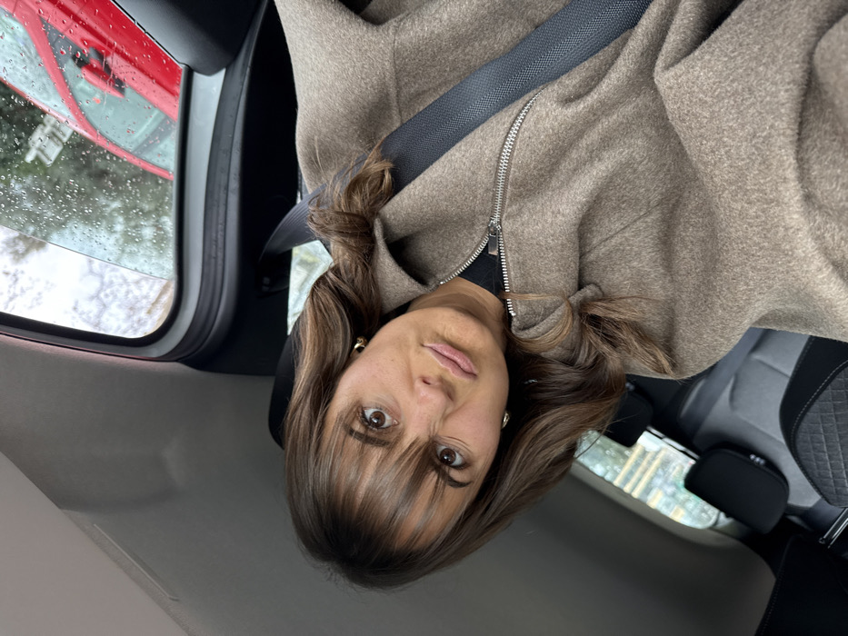 A female individual is depicted in a selfie taken inside a vehicle in Mougins, France