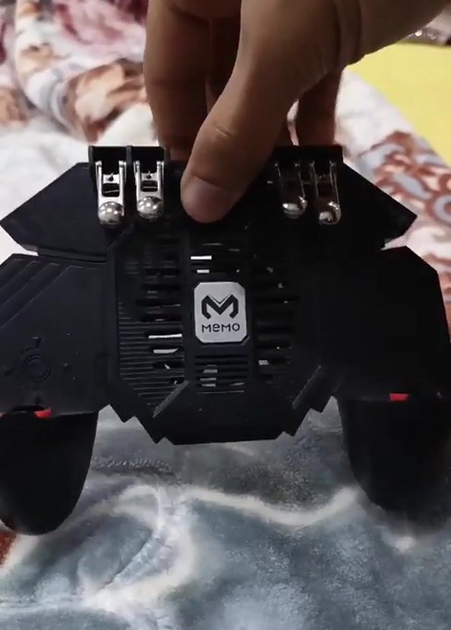 A person holds a black MEMO brand gaming controller with attached triggers. The controller has a black body, black handles on each side, a cooling fan vent with the MEMO logo in the center, and four silver triggers at the top. The person rotates the controller to show its front, back, and side views, highlighting the triggers and cooling fan. The background shows a bed with a gray, white, and red patterned blanket. The lighting is soft and diffused.