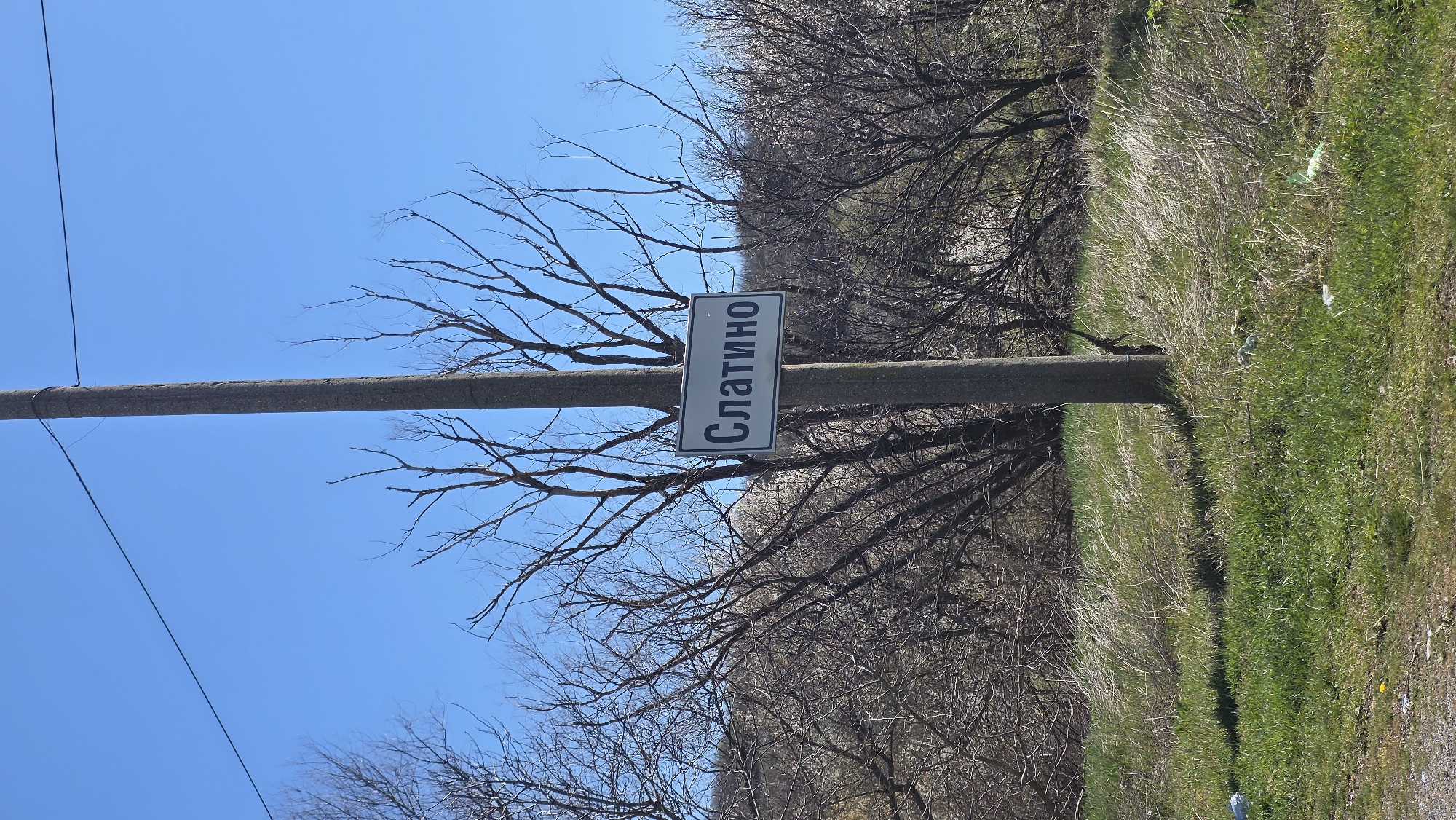 sign for Slatino, Bulgaria. The sign is attached to a utility pole. The background consists of a clear blue sky, bare trees, and some green grass.